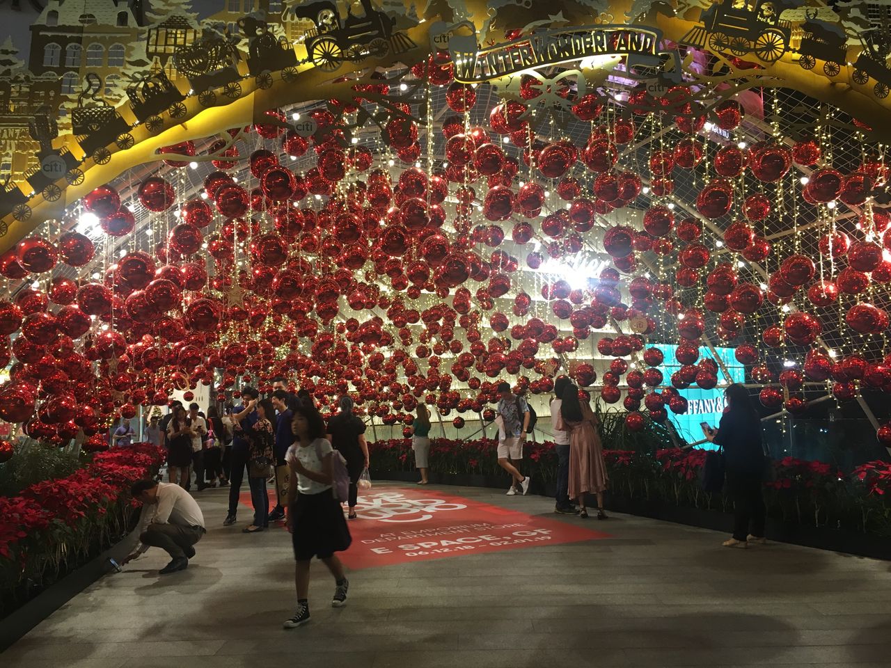 エンポリアム(The Emporium)入り口のクリスマスデコレーションです。多くの人がデコレーションの前で写真を撮っていました。