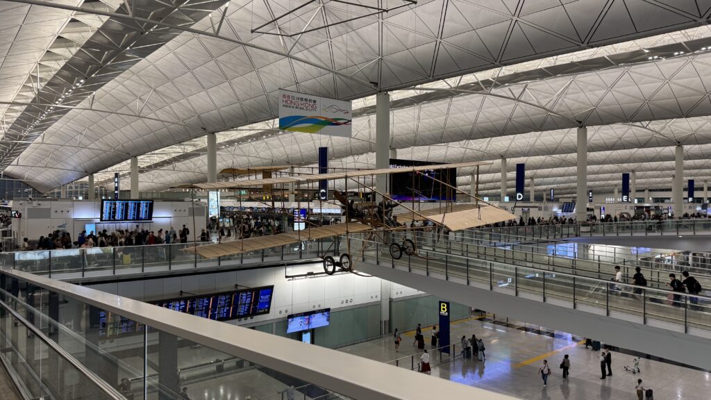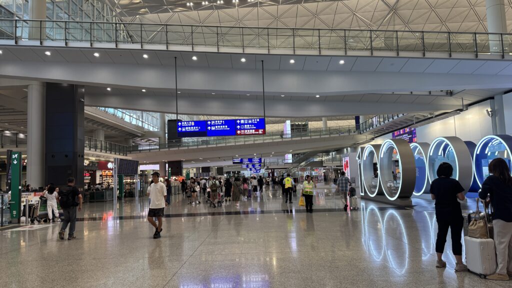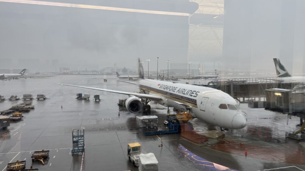 香港国際空港にやってきました。台風が来ているようですが、無事に飛行機は飛びそうです。