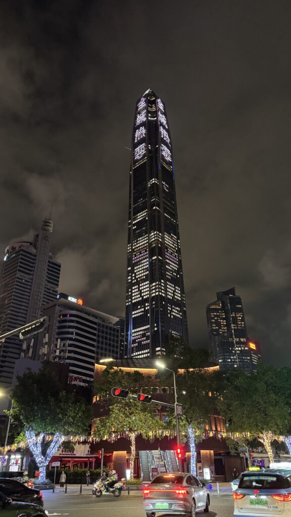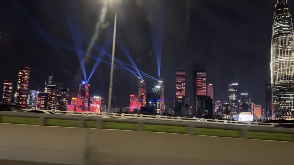 夜の深圳の街は、ビルの灯りとイルミネーションが溶け合い、まるで都市全体が一つのステージのように輝いて見えます。