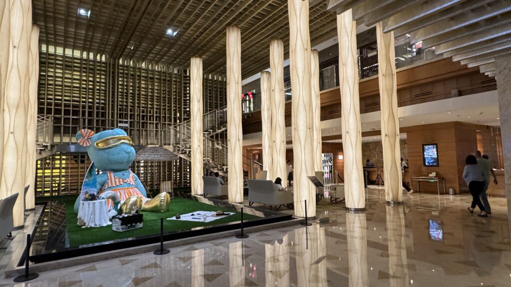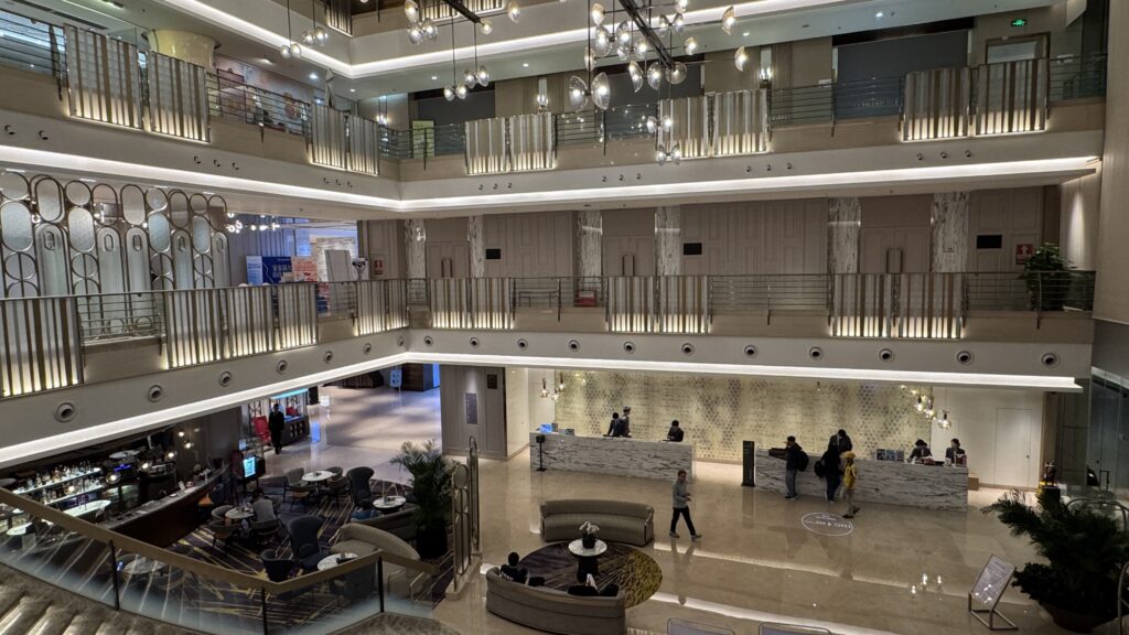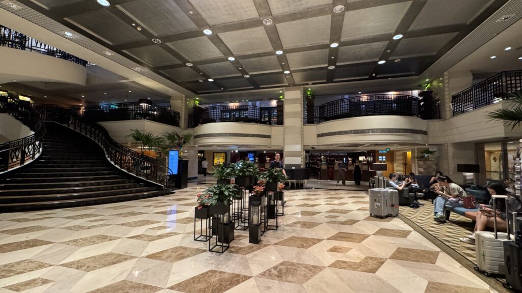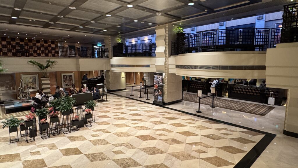 シェアランホテルのロビーは、高い天井と広々とした大理石のフロアが印象的で、クラシックな雰囲気が漂います。