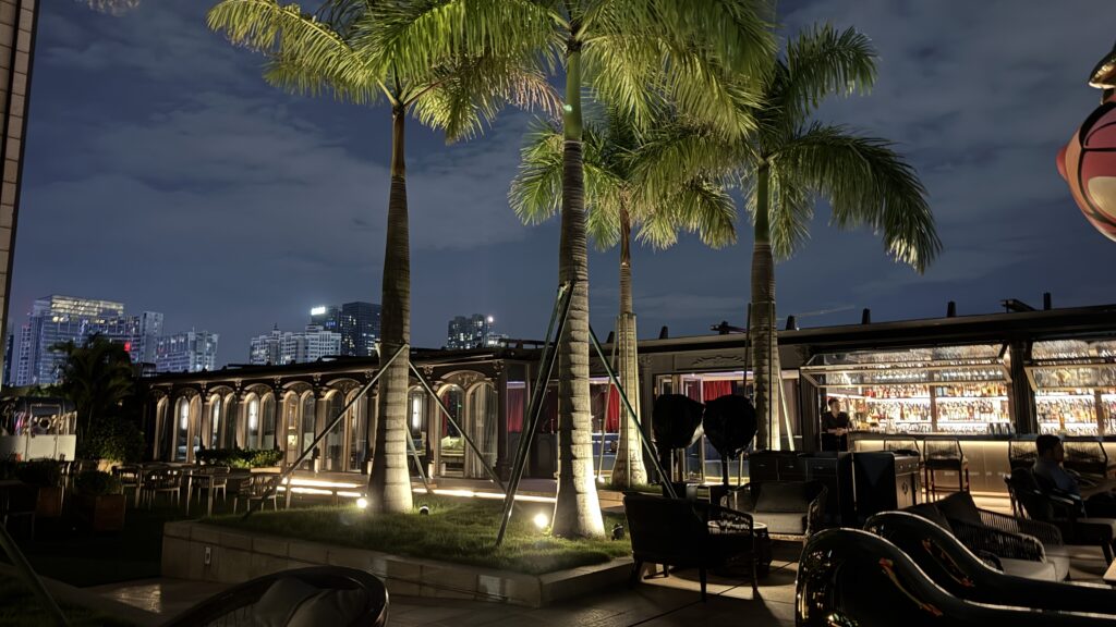 ライトアップされた椰子の木の向こうに広がる深圳の夜景を眺めながら、静かにグラスを傾けます。