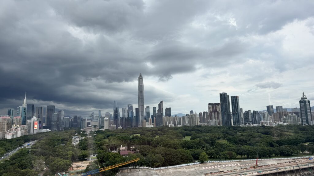 カーテンを開けると、窓の向こうには高層ビルが並び、朝の光に包まれた深圳の街が広がっています。