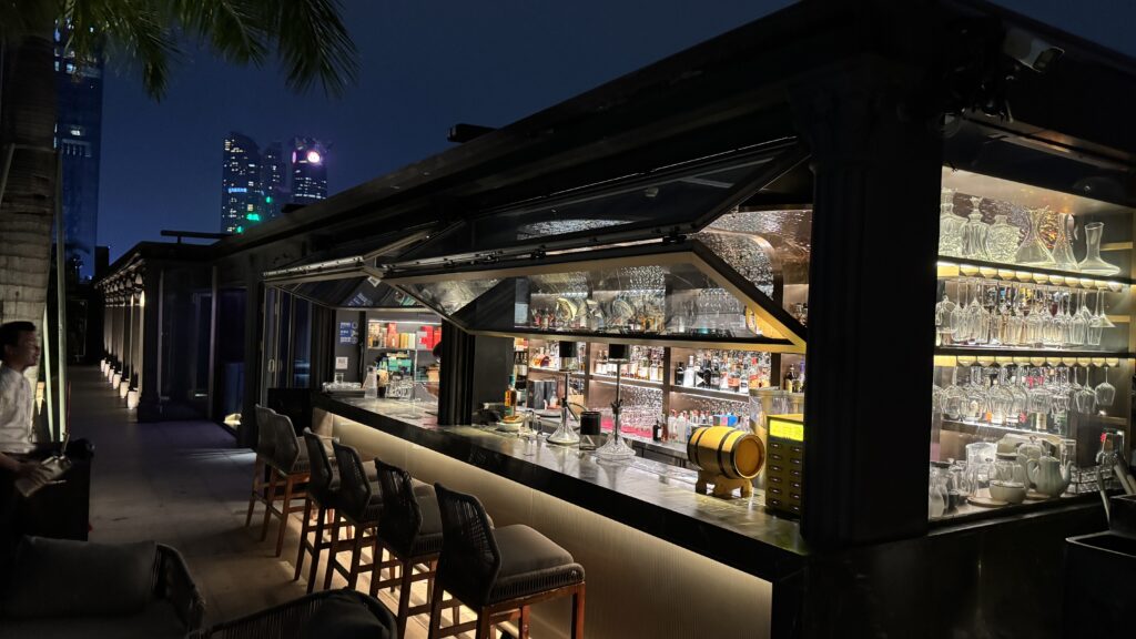 開放的な空間に流れる音楽と、グラスの氷が鳴る音が心地よく響き、出張の夜とは思えないほど贅沢な時間。