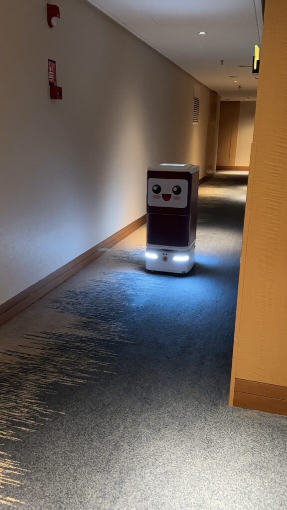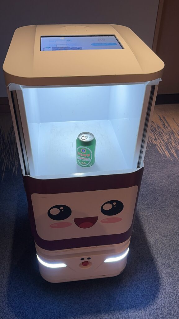 部屋で一息つこうとビールをオーダーしたところ、なんと小さなロボットがトコトコとやってきて、丁寧にビールを届けてくれました。