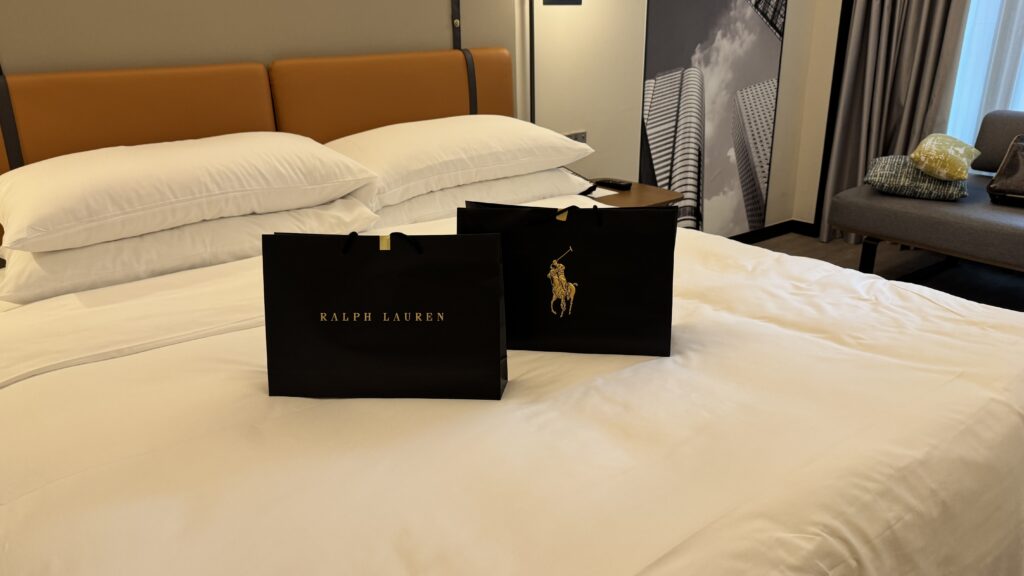ラルフローレンの上品な黒いショッパーを手に、ホテルの部屋に戻ると、不思議と気分も華やぎます。