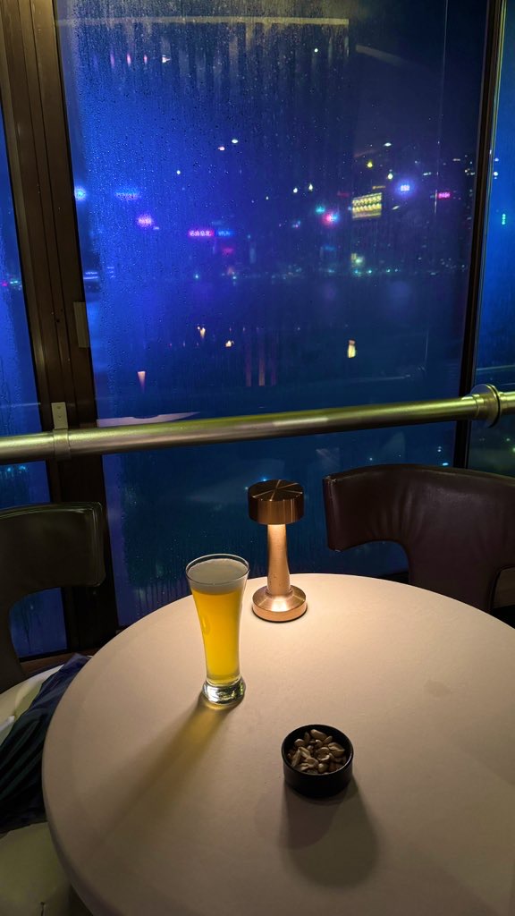 窓の外には香港の街の光が広がり、都市の喧騒を少し離れて眺めるにはちょうどいい空間。